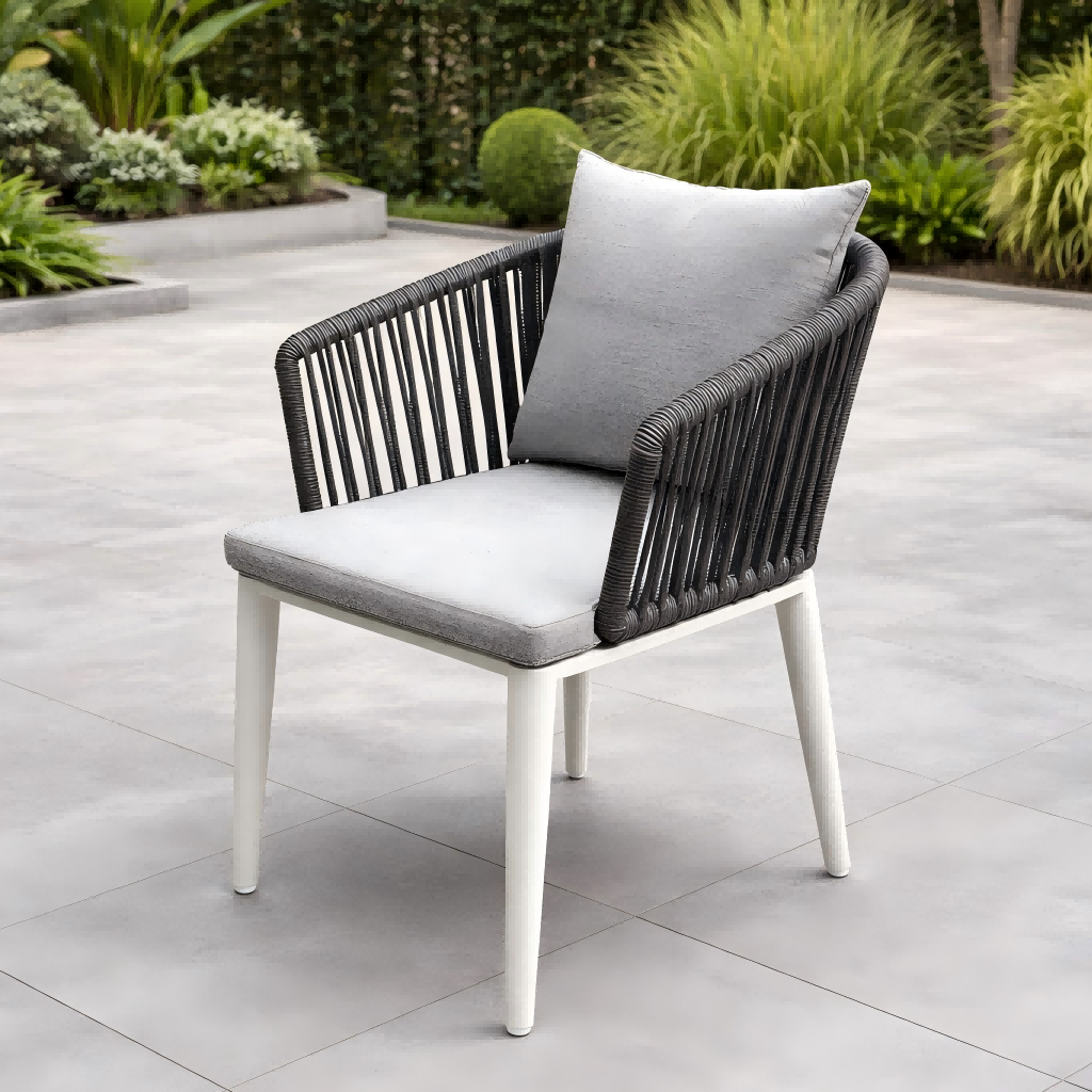 Az étkezőszékek kötéllel szőtt háttámlával rendelkeznek, amely modern és elegáns megjelenést kölcsönöz, miközben kényelmes tartást biztosít. A keret porszórt alumíniumból készült, amely kiválóan ellenáll a rozsdának és a kültéri időjárási viszonyoknak.
