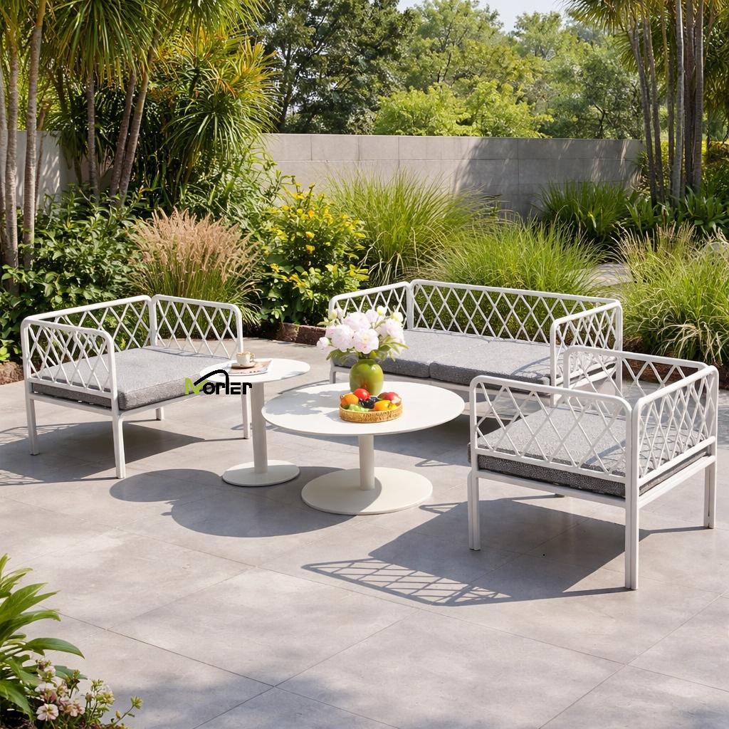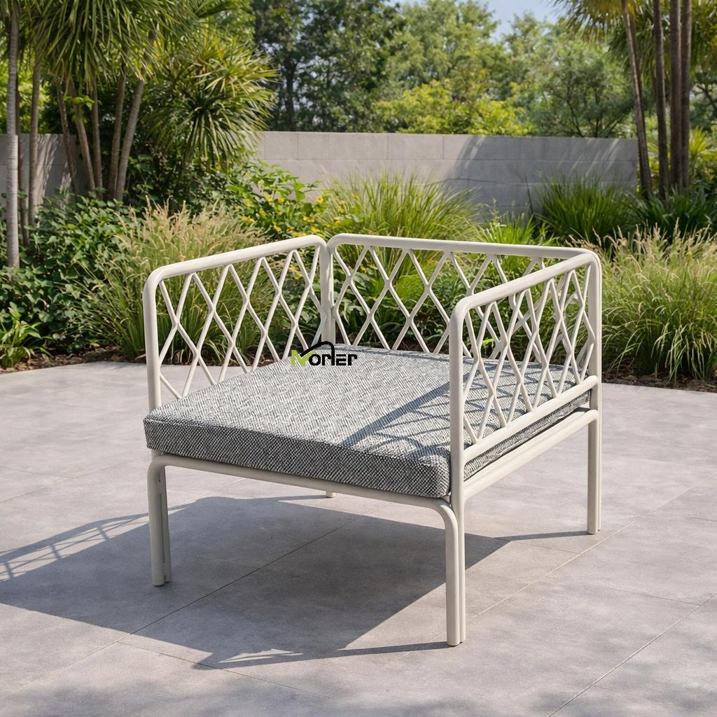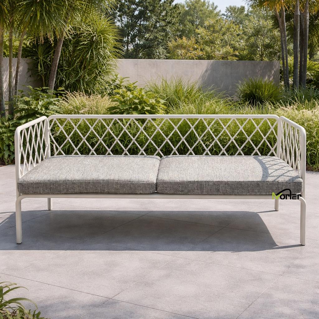Ez a modern kültéri ülőgarnitúra letisztult és minimalista dizájnnal és gyönyörűen kidolgozott geometrikus fémkerettel rendelkezik. A nyitott rácsos szerkezet könnyű és elegáns megjelenést kölcsönöz, miközben megőrzi az erős szerkezeti támaszt.